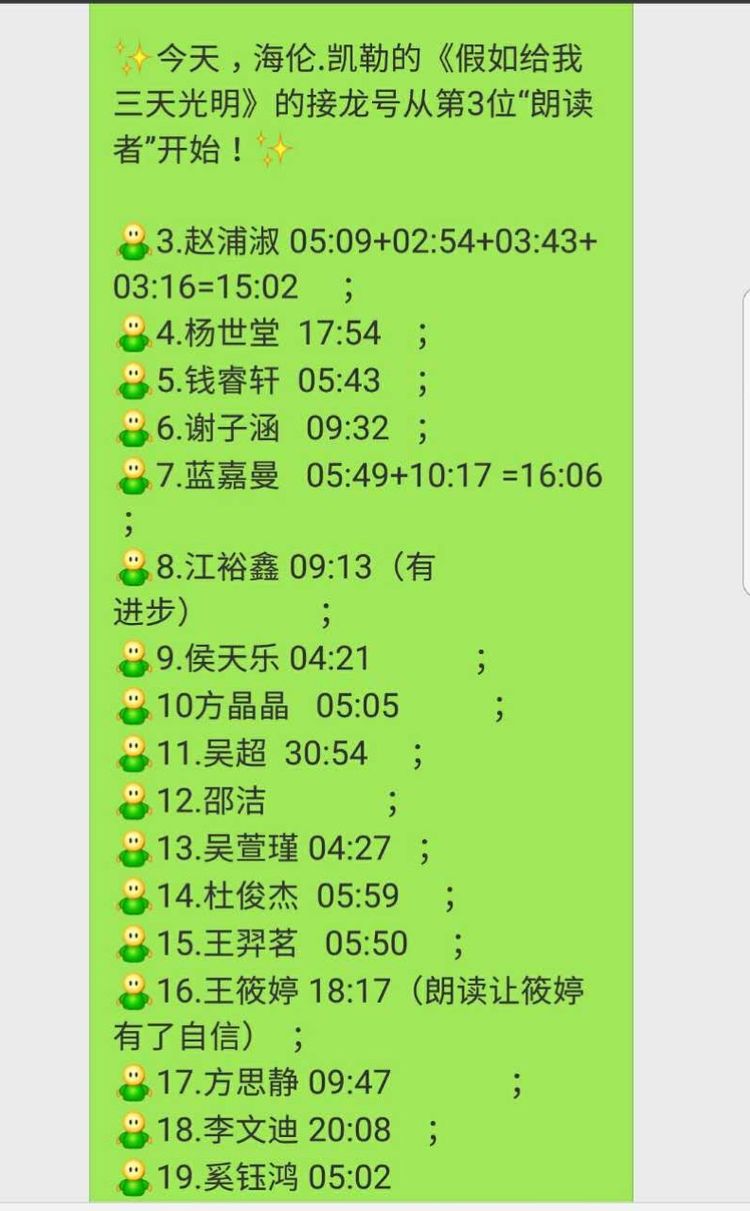 后来孩子们的阅读时间不再集中于晚上,无论晨起还是日落,阅读群随时随地的传来孩子上传的语音。孩子的激情,让我不敢有丝毫懈怠,下载录音,聆听孩子的声音,及时反馈孩子的朗读,也发生在了每时每刻。晚上当孩子们入睡后,我将录音声音调至最低,开始从当天的第一位朗读者的朗读听起,直到最后一个……收录、下载、统计、备注,直到凌晨,我将汇总全部整理完毕上传至群中。才舒一口气,安心地入睡。