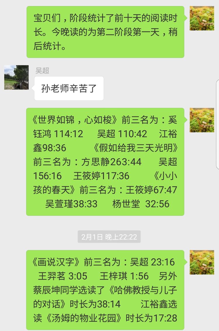 从1月21日开始,朗读开跋。晚上六点,我准时发出朗读接龙的口令。孩子们或许早已守在另一端,不到一分钟,已有七八人报上了自己的姓名。手机陆续跳出孩子的录音。虽然孩子们中有的有些胆怯,声音有些含糊。有的有些生疏,听起来有些磕磕绊绊。但孩子们不舍不弃,用最稚嫩的声音传递了文字中的喜悦、忧伤、悲苦、激情、感动、共鸣……第一晚,我将自己关在卧室里,将每个孩子的录音下载收藏至文件夹中。并打开表格统计孩子的朗读时间。我知道孩子们也渴望听到老师对他们的反馈。我赶在晚上十点,将孩子们的录音进行了回复。