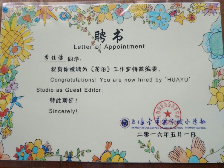 三年级的佳洁已被学校《花语》工作室聘为特邀编委,有一个月她们每天中午要审稿件,她审稿时非常严格,文字要好,配图要美。