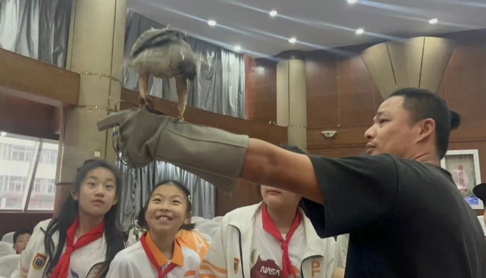 讲座开场,施老师便带来惊喜 —— 鹰、鸽子和宠物鸡。同学们近距离感受鹰爪的触感,观察鹰的体型和动向;触摸鸽子,感受它们的体温,了解到鸽子属于恒温动物,无论严寒酷暑体温都相对恒定;轻轻触碰宠物鸡的鸡冠,新奇又有趣。