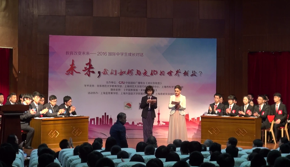 11月25日上午,中国国际广播电台《成长你我他》栏目在上海金苹果学校举办“‘教育改变未来’——2016国际中学生成长对话”,来自三所国际高中的29位同学在现场展开热烈讨论,专家评委及来自上海金苹果学校、上海外国语大学附属双语学校和上海德威英国国际学校三所学校的师生等400多人观看了这场别开生面的对话。