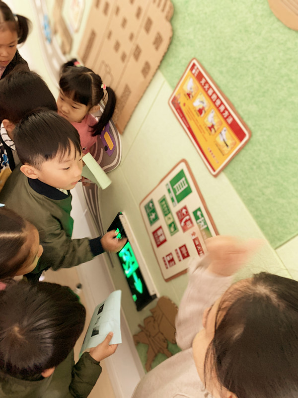 如果发生了火灾,该怎么逃生呢?瞧!老师带我们认识了安全出口、警报器、还有逃生路线。