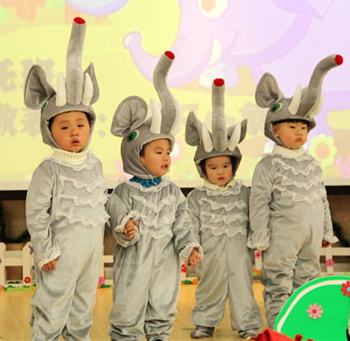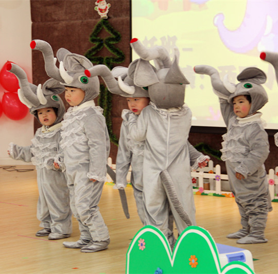 大大的耳朵像扇子,厚厚的身体像面墙,长长的鼻子向上扬……快看,小象们河边走,扬起鼻子勾一勾,就像一对好朋友,见面握握手~——托班的弟弟妹妹还为我们带来儿歌表演“两只小象”。
