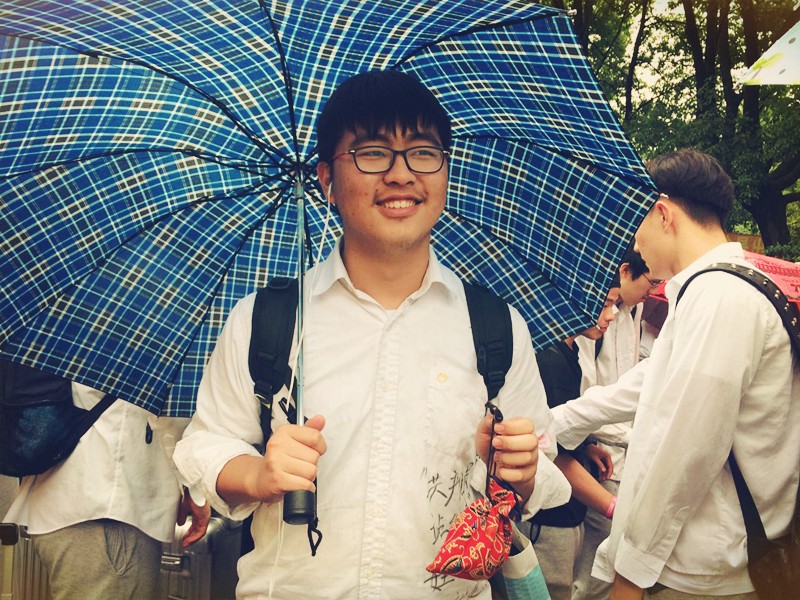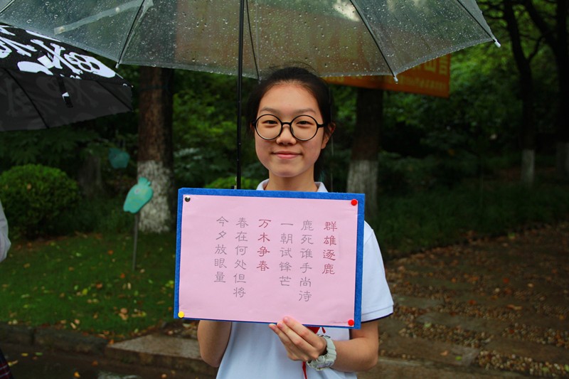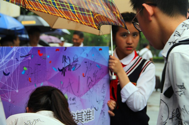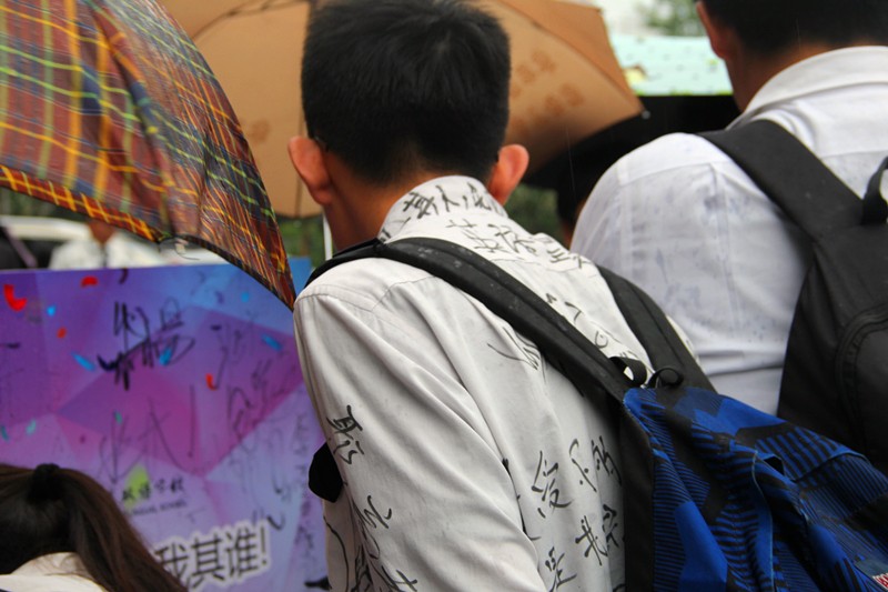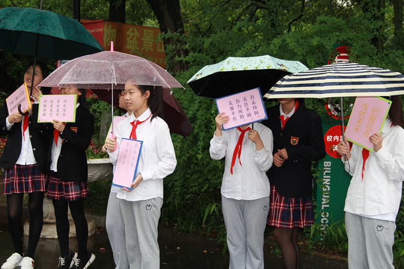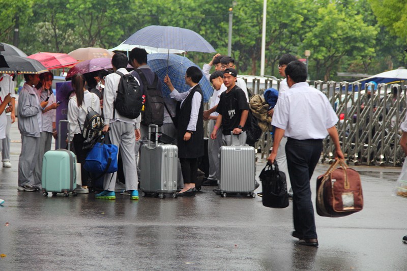 虽然是第八节课时间,虽然此时下着中雨,但是不少同学仍然请假,来为高三的学长学姐们送行。