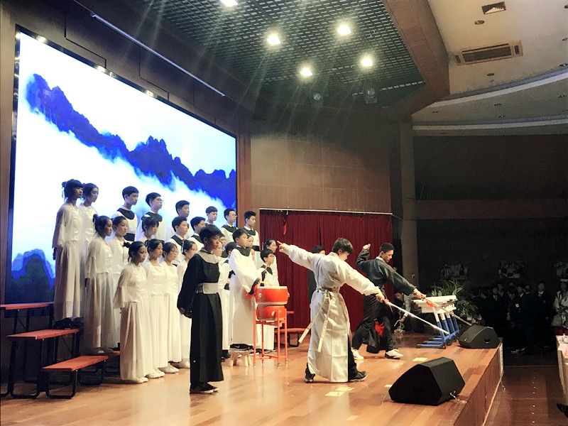 她在致辞中充分肯定了师生们在本届语言文化节四大主题活动中所展现的风采。对文学社团名称征集活动中师生们高涨的活动热情、精致的作品呈现表示赞许,对作文竞赛、古诗文竞赛师生们付出的努力和取得的成绩表示感谢。对口才与交际活动的广泛开展并逐渐形成德育课程,使之序列化表示她表示认同。她表示,学校把开展“中华经典古诗文诵读”活动作为学校办学文化、办学理念的精品工程加以建设,形成年年办节、年年创新的惯例,崇尚文化育人、根深叶茂的风气,把经典诗文诵读活动与学校培养具有中华情怀、国际视野的博雅学生相结合,会努力营造“与经典同行,与圣人为伍”的校园文化氛围,会为培育具有深厚文化底蕴的育人环境,培养具有华夏血脉的文化新人不懈努力。她也希望通过这次活动,进一步激发全校师生诵读经典、扎根经典的兴趣与热情,使大家在诗文诵读中,沐浴传统文化的恩泽,研习中华美德的教化,接受语言艺术的熏陶,永葆树根立魂的本色,确立正确的人生观、世界观和价值观。