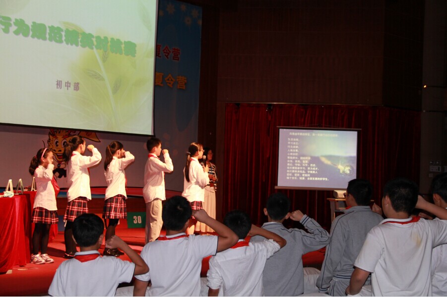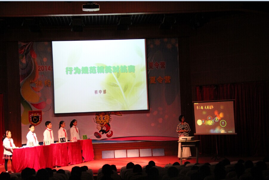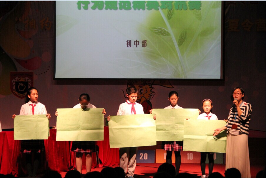 分为“文雅小诗”、“光影流年”、“边学边玩”、“千里之行始于规范”四个环节的行为规范精英对抗赛在选手们做完自我介绍后就正式开始了,他们分别是来自预备1班的徐欣奕、预备2班李佳婧、预备3班钱涛、预备4班娄彭咏烨、预备剑桥班的李姌歌。他们在大家的欢呼中闪亮登场!