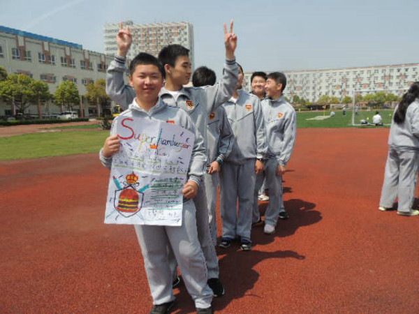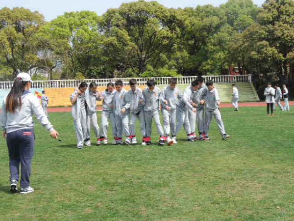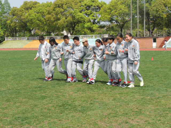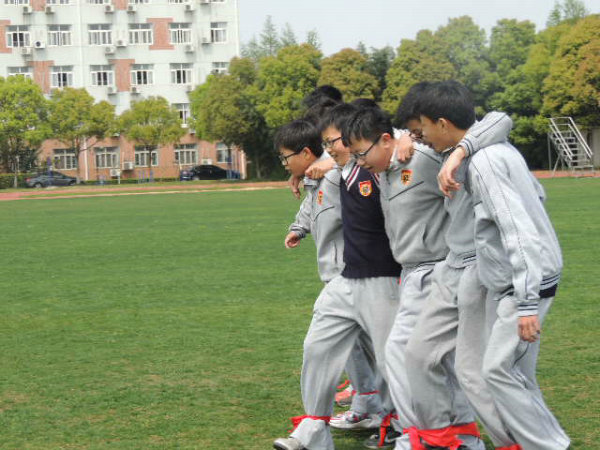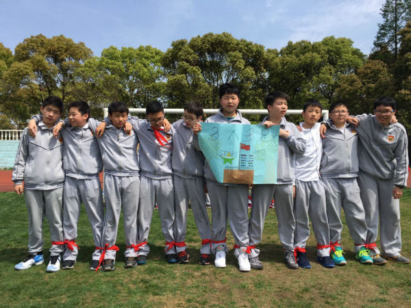 初一剑桥班的Super hamburger队顶住压力,随后也开始了他们的比赛。没想到不给力的绑腿带出现了本场第二次脱落,拖下了前行的进度,成绩远远落后。但这并不影响孩子们的热情,因为前一队“团结就是力量”的响亮歌声还在每一位在场人员的心中回荡。
