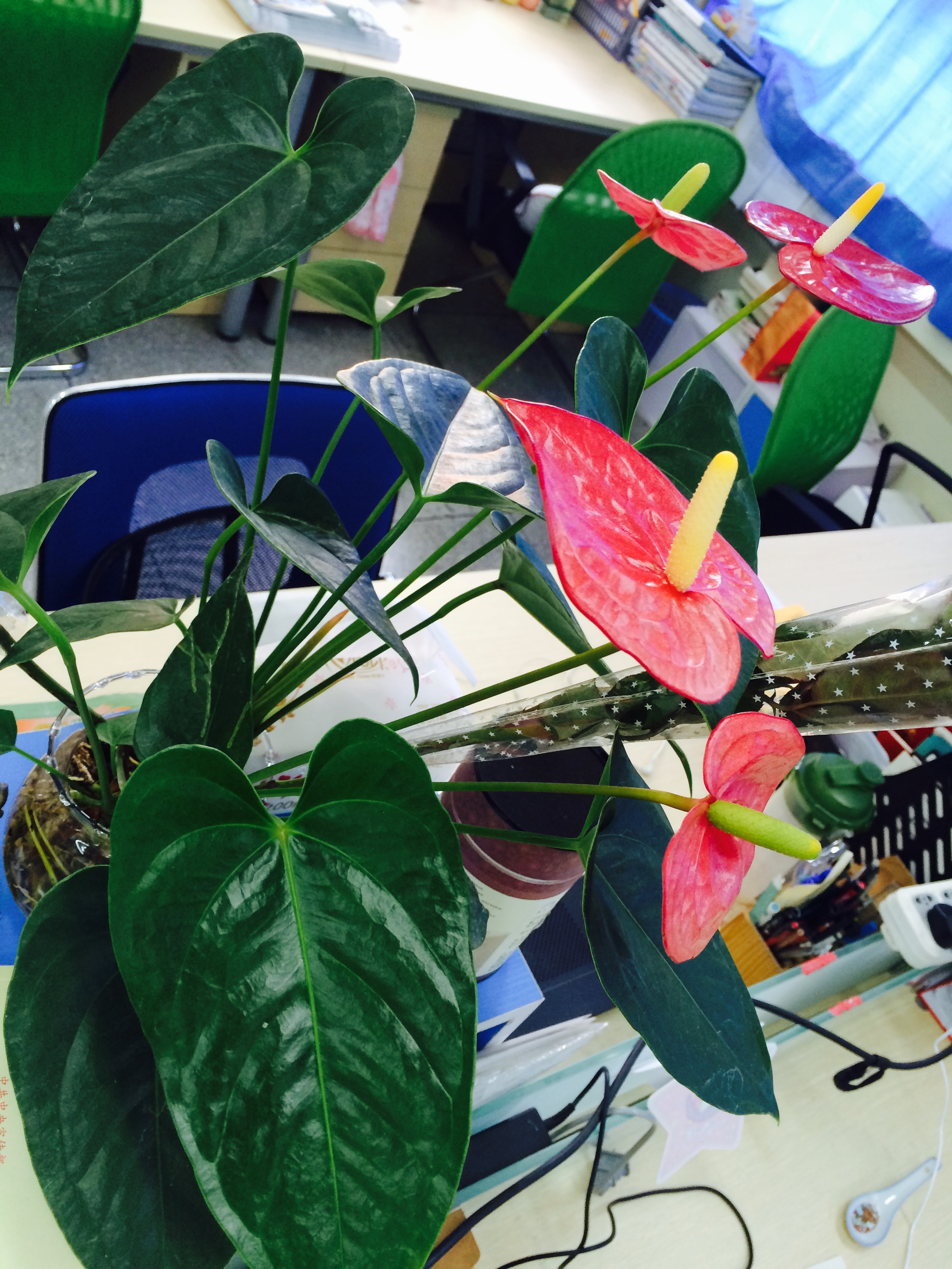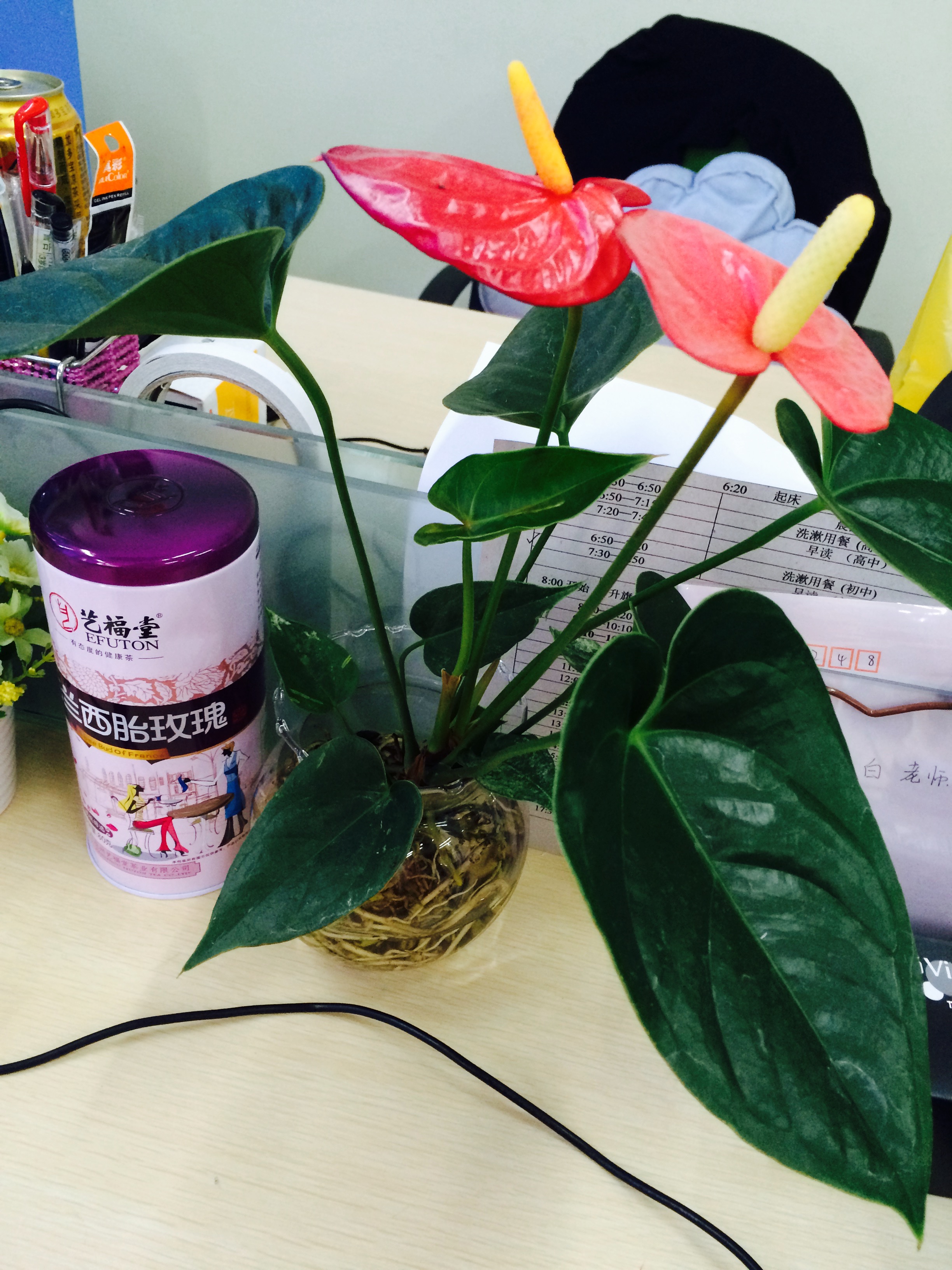 9月5日周一的中午,孩子们就抱着一盆盆红掌来到老师们的办公桌前,悄悄为每位教师装点工作环境,除了绿色植物和轻声的祝福,他们什么都没留下。