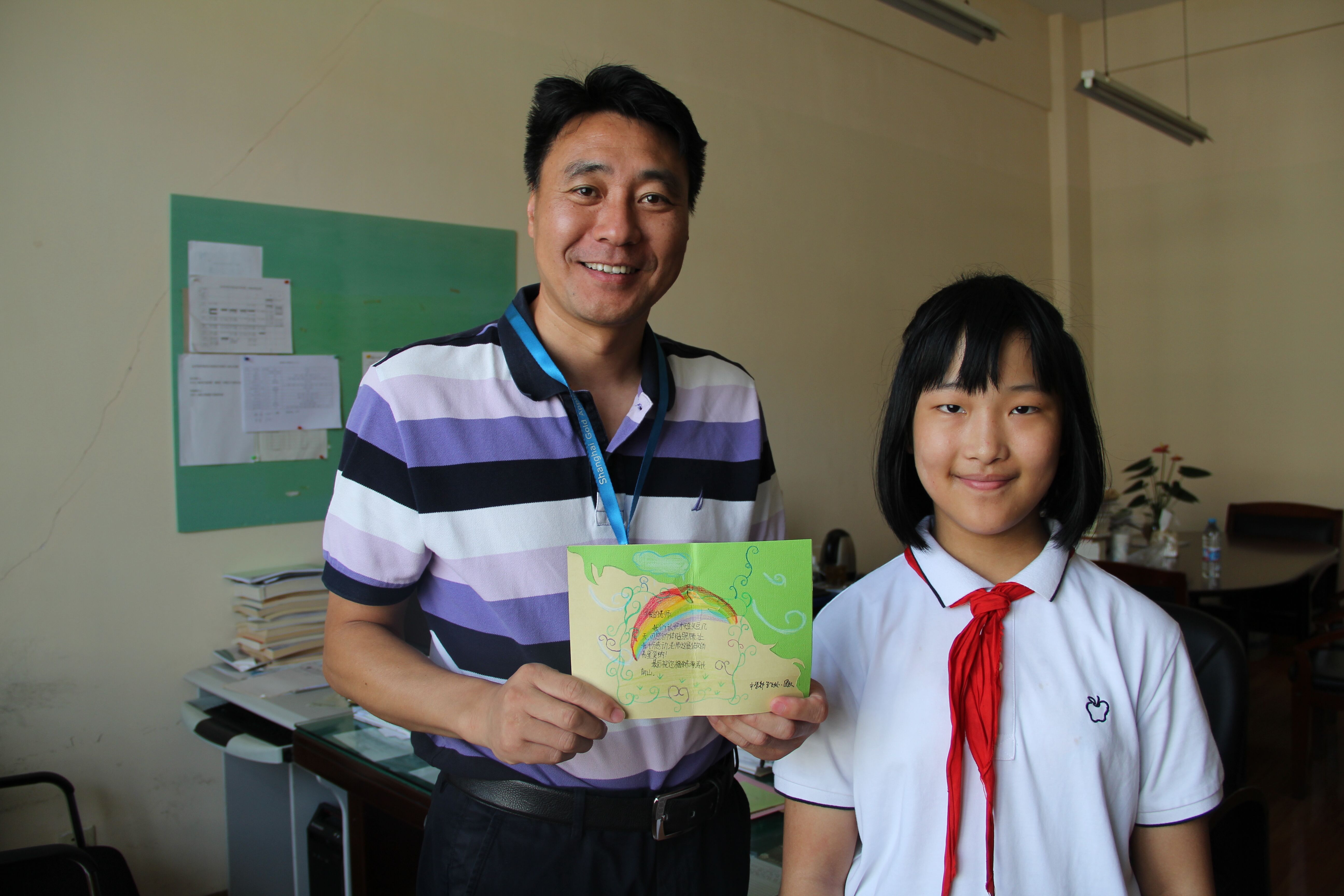 当上课归来的老师们惊喜于悄悄到来的鲜嫩植物时,其实学生们也在进行着另一项工程——手工心意卡的制作。他们用课余时间制作了小小的卡片,并在9月9日当天亲手将卡片送给亲爱的老师们。