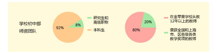 金苹果学校中学部师资力量雄厚,名师人才荟萃。教育教学、教改创新过程中,发奋图强,开拓进取,从课程的 单一到多元,从做大做好到做强做精,教育教学成效卓著。如今,中学部已经成为金苹果学校首屈一指的中坚学部,并且成为了上海市民办教育界中的佼佼者。