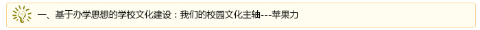 “苹果”是一种太神奇的水果--夏娃吃掉的那个苹果,让我们人类对整个世界充满了好奇和欲望;掉在牛顿头上的那个苹果,让他发现了“新知--万有引力定律”;大苹果-----纽约的昵称,是国际经济、金融、艺术、传媒之都,联合国总部所在地,大苹果成了全球政治、金融变化的最前沿。而乔帮主“咬过”的那个苹果,则用一次次的创新改变着整个世界;今天,我们这第五个金苹果将为改变中国的教育义无反顾的担当起一份道义和责任。苹果的生命力--好奇心、审美力、质疑力、求知欲、创新力、引领力、担当力,“苹果力”将浸润在孩子们的课堂、寝室、餐厅、图书馆。生活的每一个时空。因为对色泽鲜艳的苹果的好奇,唤起了学生品尝感受的欲望,这样的校园,带给人们的是不断挑战自己的勇气和希望。