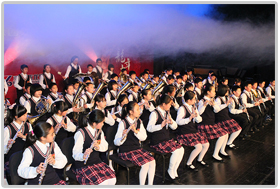金苹果学校初中学部但注重学生的各学科学习成绩,还努力强化艺术教育、综合素质与各项能力的培育。图为学校管乐队在亚龙集团迎新春联欢会演奏曲目