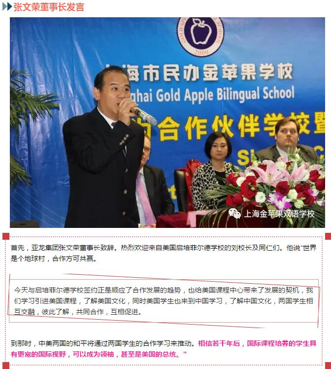 在各种优秀品德中,希望在座的同学首先要具备责任感和感恩之心。成为领袖,更要懂得担当,要有服务意识,同时要对周遭的一切充满感激之情,包括我们学习的优良环境,父母给予的关怀,老师给予的培养,朋友给予的帮助等。预祝金苹果学校和美国启培菲尔德高中合作顺利,共赢发展。”