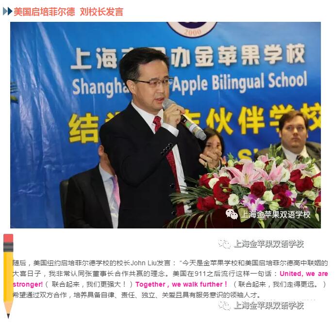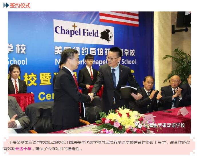 2017年3月23日,上海金苹果双语学校与美国纽约启培菲尔德学校正式签约,成为了战略合作伙伴学校。