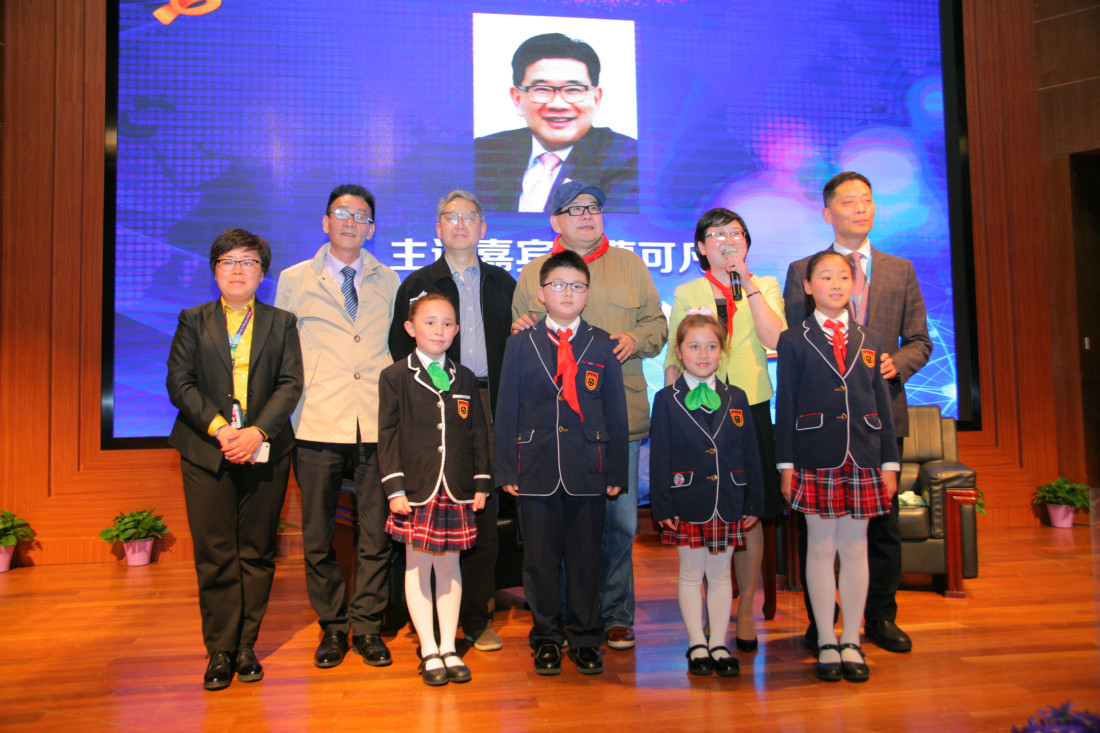 主要领导合影留念(左起依次:于家太、谭轶斌、尹后庆、曹可凡、张文荣、胡福臻) 金苹果学校创办人、亚龙集团董事长张文荣先生陪同介绍 曹可凡先生亲切与金苹果学生交流 论坛开幕倒计时 主持人谭轶斌老师讲话 曹可凡先生开讲 曹可凡先生的演讲非常精彩,在场观众座无虚席,整整近两个小时的聆听,不少观众拿着本子手写记录。 进入互动环节,曹可凡先生回答在场观众的提问及网络在线提问,每一个问题都力求解答详尽。 现场观众互动 金苹果学生提问 本次论坛采用了微信直播技术,在线问题提交及直播解答同时进行。 获得曹老师签名的出版书籍 金苹果学校少先队代表为曹可凡老师献花并系红领巾 与论坛工作人员合影留念