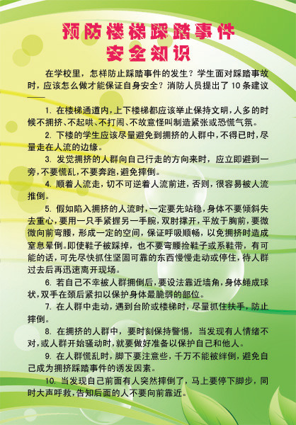 各学部加强学生的安全教育和常规教育, 充分利用广播、板报等形式和班会、团队活动、集会等途径对学生进行纪律安全及自救、自护等知识的专题教育,结合有关发生在学校楼梯间拥挤踩踏而引发的伤害事例,有针对性地对学生开展拥挤踩踏事故专题教育,提高学生的防患意识;教育学生课间不得追逐、跑跳、打闹,使学生养成相互礼让、遵守秩序、上下楼梯轻声慢步并靠右行的良好习惯。