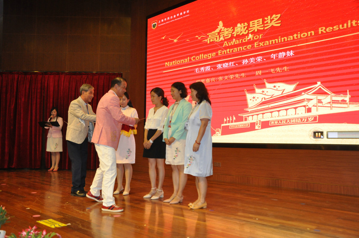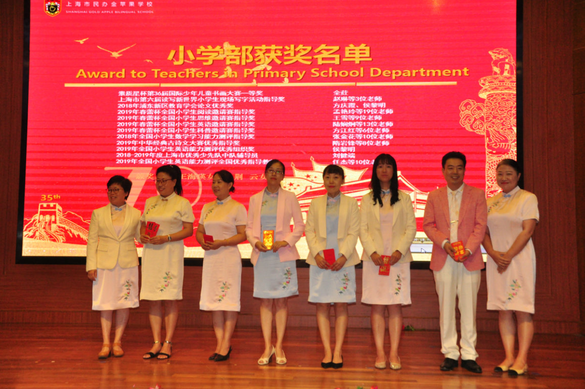 会上校领导为在本年度获得区园丁奖、优秀党员的教职工颁发了奖状、为在本年度指导学生参加市、区教育教学活动中取得优异成绩的教师颁发了奖状。