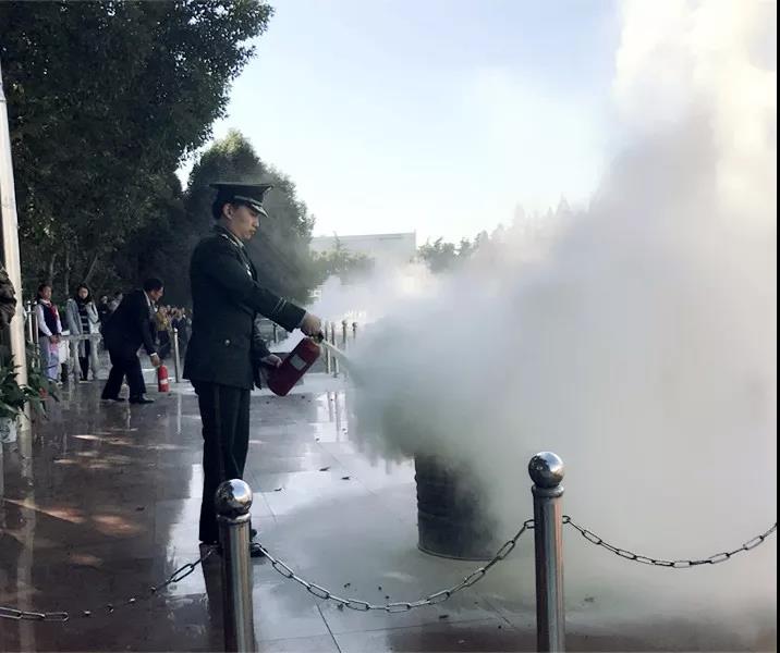 邹参谋讲解处理火灾小常识,指导灭火。介绍灭火器的种类、灭火器的使用、灭火过程中的安全事项。