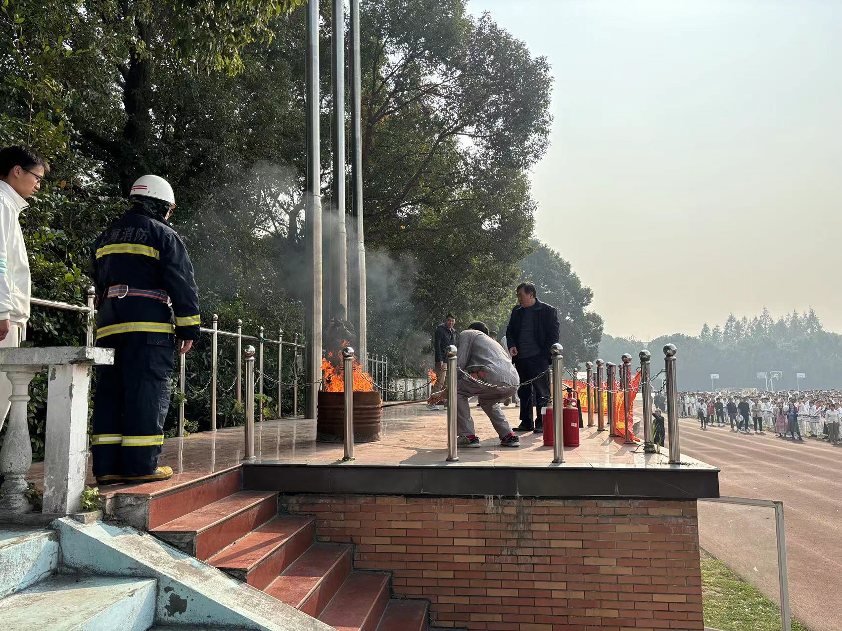 一小时后伴随着教学楼附近红色烟雾的徐徐升起,消防演练正式开始,学生们有序开始从教室撤离,“逃生”到操场,随后观摩消防培训和消防支队消防演示。