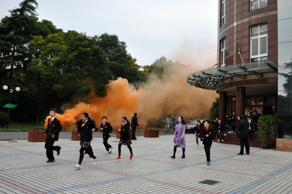 7:49:30时,警报响起,模拟火情爆发,学生老师撤离教室,奔向操场