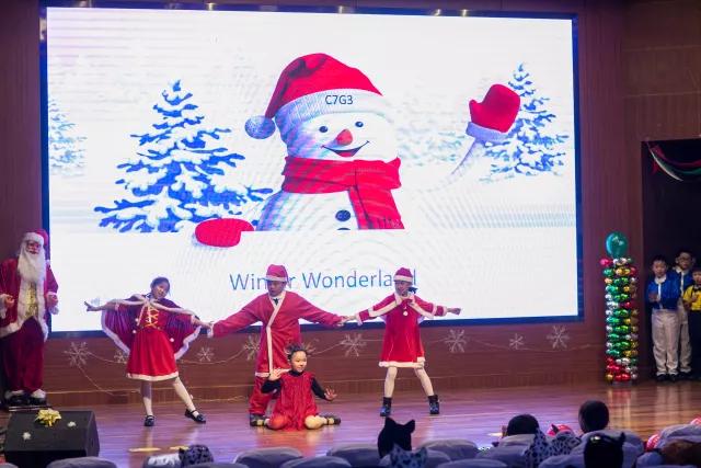 09:00 圣诞钟声敲响, 一年级家长Echo 携双胞胎女儿及在金苹果幼儿园读书的儿子走上舞台,在三个萌娃稚嫩的宣布下, Christmas party begins!