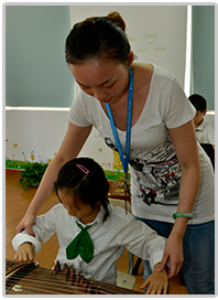 艺术中心之所以对一年级的学生开设古筝普及课程,是因为这个年龄段的孩子接受能力强,对新鲜事物的敏感度高,是挖掘积极性和理解能力的最好时机。针对一年级无基础的孩子,在弹奏技巧上多半是学会左右手的勾抹托的指法,即大拇指、食指、中指这几根手指,可以说指法简单,方便易学。老师上课所用教材在编写上也非常符合循序渐进的特点,乐曲大多是是孩子们熟悉的儿歌所改编,每一条练习针对的知识点清晰,让孩子有效地理解和掌握!