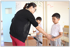 金苹果艺术中心开设的小提琴普及课特别针对一年级孩子的特点,本着寓教于乐的教学理念来进行的。首先,要培养学生成为会思考的学生。也就是要想清楚每次练习的重点是什么,通过老师的示范引导,让学生明白我要掌握什么,还要改进什么。其次,要让学生觉得拉琴应该是一个美妙享受的过程,而不要看作是任务和负担。对初学的孩子来说,刚开始练持琴和空弦是一段有些枯燥的过程,这时老师会加入音乐欣赏、名人故事及一些孩子们耳熟能详的儿歌,让孩子们边欣赏边练习,既提高了兴趣,又完成了练习。最后,要欣赏孩子的每一点进步并加以鼓励,用赏识的眼光看待孩子,使之成为孩子学琴的动力。