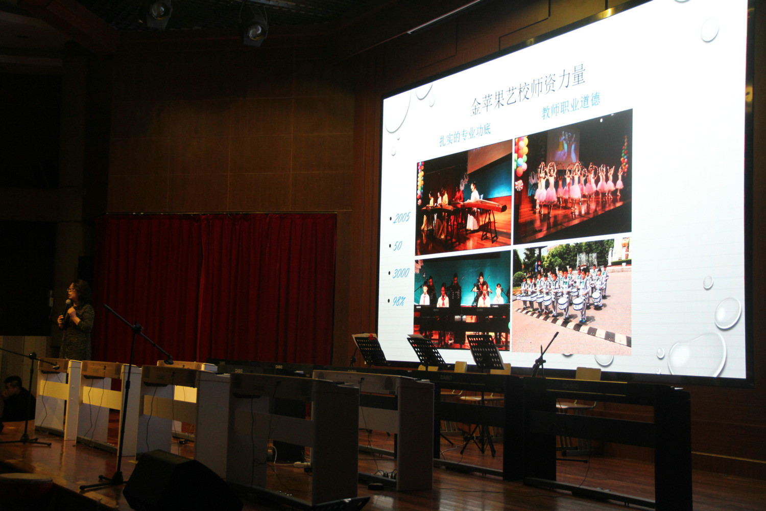 2018年1月5日,在金苹果学校会议中心上演了一场以2018迎新年为主题的学生艺术才艺音乐会,艺术中心的学生为在场近500多名观众展示了丰富多彩,有舞蹈、钢琴弹奏、古筝、打鼓等表演,都是以小学和中学生为代表、演出策划人和表演指导都是金苹果艺术中心的资深老师。这场精心准备的演出得到了家长和社会的广泛认可。