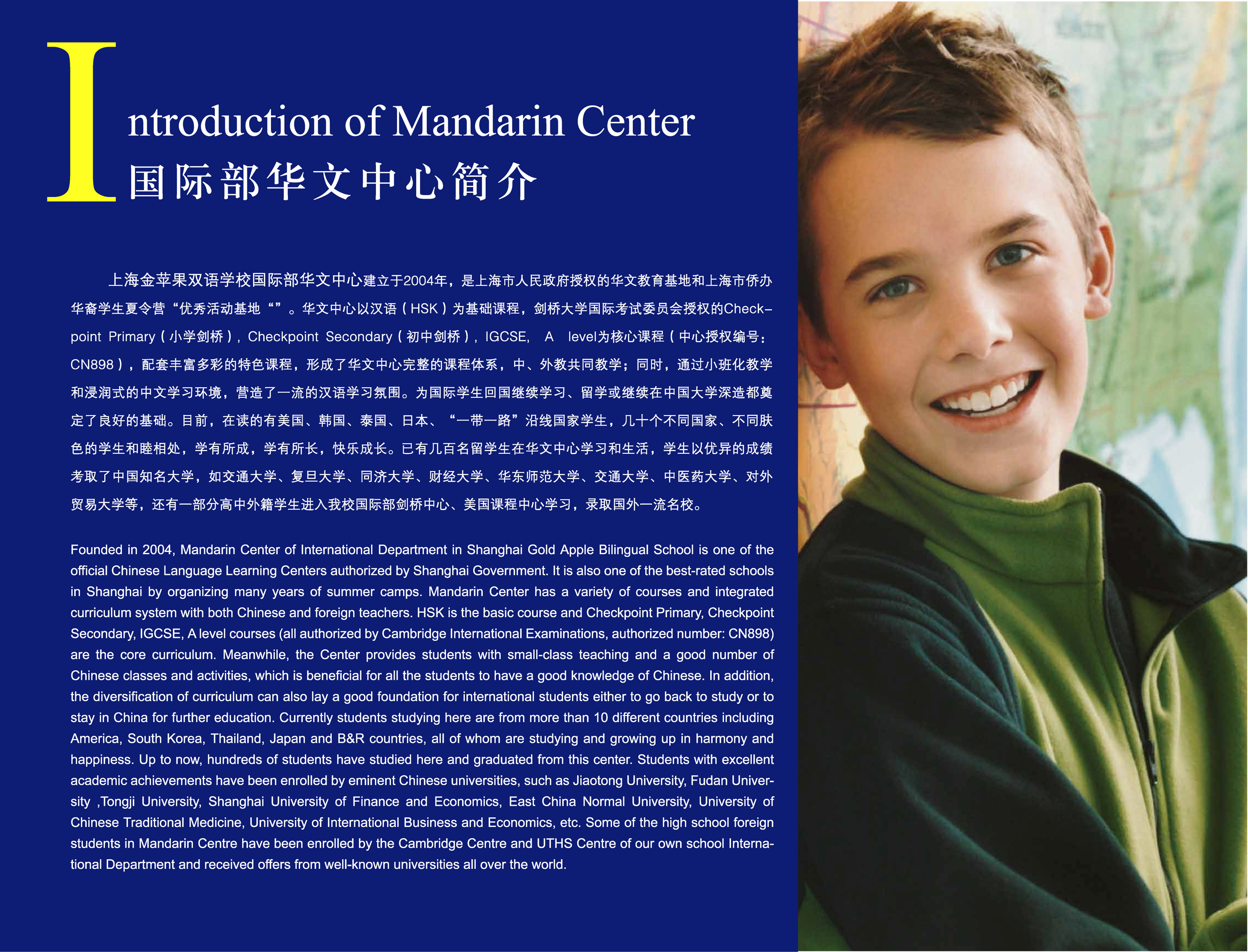 Founded in 2004, Mandarin Center of Shanghai Gold Apple Bilingual School is one of the official Chinese Language Learning Centers authorized by Shanghai Government. It is also one of the best-rated schools in Shanghai in organizing many years of summer camps.