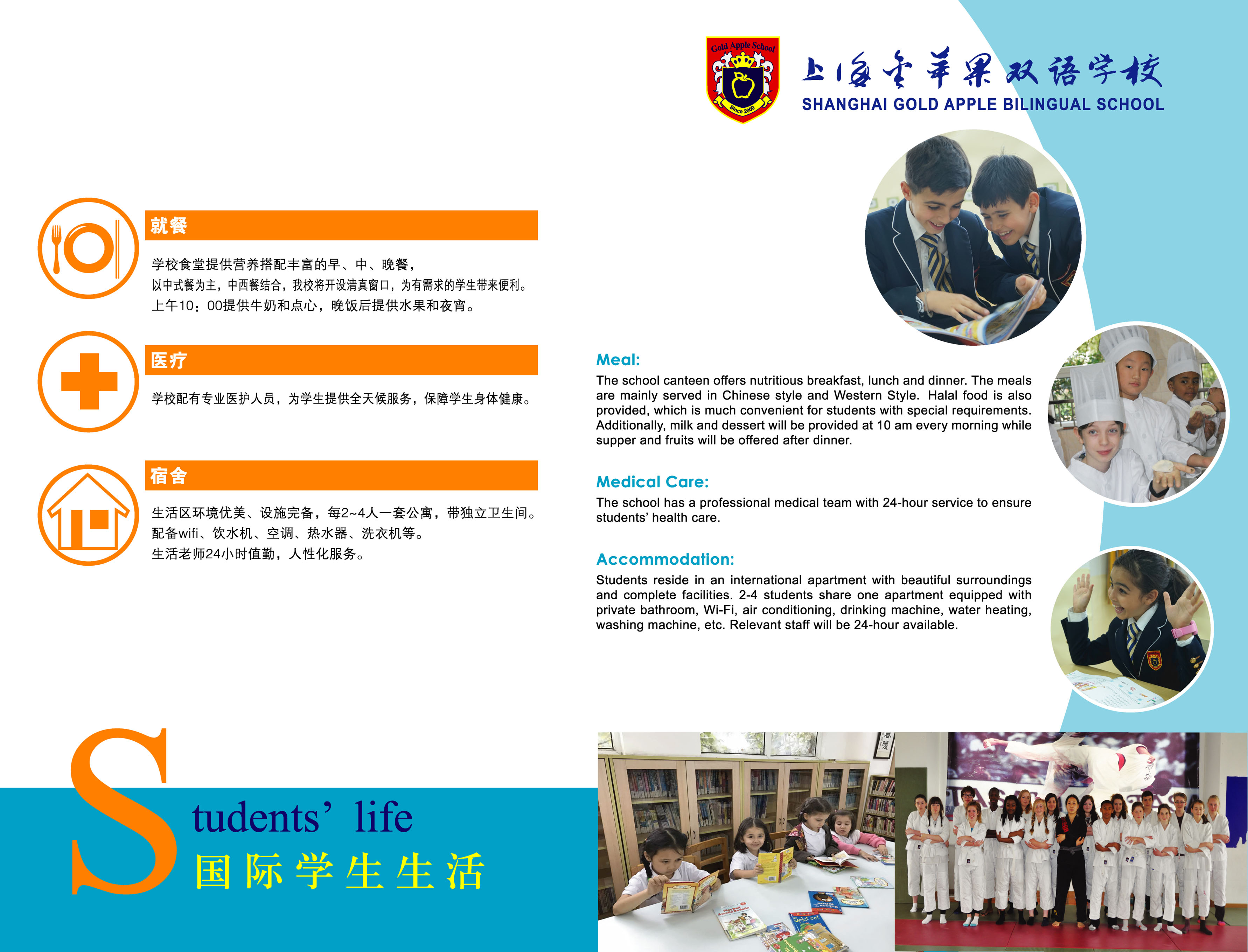 宿舍:生活区环境优美、设施完备,每2~4人一套公寓,带独立卫生间。配备wifi、饮水机、空调、热水器、洗衣机等。生活老师24小时值勤,人性化服务。Meal:The school canteen offers nutritious breakfast, lunch and dinner. The meals are mainly served in Chinese style and some Western foods are also provided. We also provide Halal food, which is much convenient for students with special requirements. Additionally, milk and dessert will be provided at 10 am every morning while supper and fruits will be offered after dinner.Medical Care:The school has a professional medical team with 24-hour service to ensure students’ health care.Accommodation:Students reside in an international apartment with beautiful surroundings and complete facilities. 2-4 students share one apartment equipped with private bathroom, Wi-Fi, air conditioning, drinking machine, water heating, washing machine, etc. Relevant staff will be24-hour available.