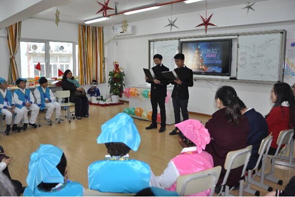 在我们精心装扮过的充满圣诞气息的教室里,板报上那憨态可掬的圣诞老人,窗户玻璃上各种圣诞贴花,挂满各种漂亮挂饰和彩灯的圣诞树……浓浓的节日气氛迎面扑来。12月24日中午时分,伴着欢快的圣诞音乐,家长们陆续到来。他们从家里带来了自己国家的传统美食,有韩国的紫菜包饭、泡菜饼,巴西的牛肉饭,科威特的巧克力饼干,尼日利亚的熏鱼等等。连同学校食堂为我们准备的食品,都被整齐地摆在靠窗的墙边,香味充斥了整个教室。引得好多同学都忍不住走上前趁没人注意,偷偷尝一口。家长纷纷落座以后,孩子们被安排在自己家人的旁边。此时,我们惊奇地发现平时表现调皮的孩子在他们妈妈的身边,却变得十分乖巧呢。家长与孩子、老师们在教室里愉快地互动着,沟通孩子们平时成长中的问题。