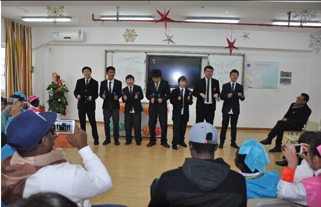 12点左右,圣诞家庭聚会正式开始了。亚伯拉罕和李晓平作为本次家庭聚会的主持人,默契十足。一英一中,诠释的是华文中心的特色。在表达了对家长的欢迎以后,国际部校长江校长为我们做了讲话,他用流利的英语表达了对家长们的欢迎与节日的祝福。接下来便是最让老师和家长们眼前一亮的表演。两个班的孩子为圣诞节准备了两个节目。当华文(1)班的孩子们换上中国传统服饰——汉服,盘腿坐在那里,摇头晃脑背诵《三字经》时,我们有种穿越了的感觉。他们用稚嫩但却自信的中文,认真地诵读《三字经》时,在场所有人纷纷给他们鼓掌,并举起他们手中的相机和手机,记录下这有意思的一刻。华文(2)班的男生为大家表演了西班牙圣诞歌曲。他们穿上帅气的西装,洒脱地晃动着手中的沙锤,欢快的歌声配合沙锤的节奏,展露了华文男生阳光的一面。正当大家对这两个节目意犹未尽之时,华文中心负责人尚琳老师请出了家长代表,尼日利亚大使为大家发言。他讲述了自己两个孩子在金苹果华文中心2个月的学习生活中得到的进步,对学校工作的肯定和感谢,也祝愿所有人圣诞快乐。之后,尚老师发表了简短的发言,感谢家长对学校工作的支持,表达了对节日的祝愿。接下来的环节想必是最令孩子们兴奋的了。尚老师刚说大家可以开动啦,孩子们一窝蜂凑到食物前,面对着十几种各式各样的美味,真是无从下手。孩子们盘子里装满了食物,一边吃,一边评价着各种美味。郑敏成的妈妈准备的韩国食物似乎是最“畅销”的,孩子们吃着寿司、泡菜饼,啧啧称赞着,纷纷竖起了大拇指。郑敏成坐在妈妈身旁,别提有多得意了。教室里播放着悠扬的音乐,大家享用着美味的食品,互相交谈着,说笑着,一幅幅其乐融融的画面。聚餐结束后,同学和老师一起将教室打扫干净。