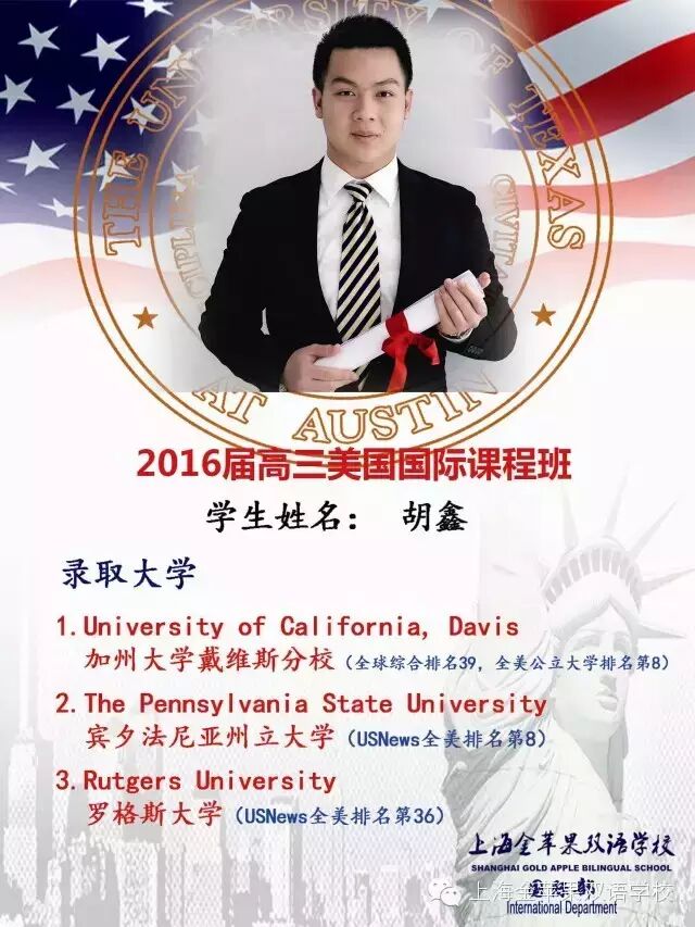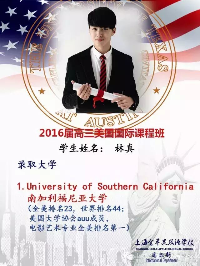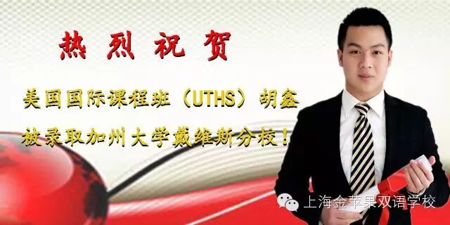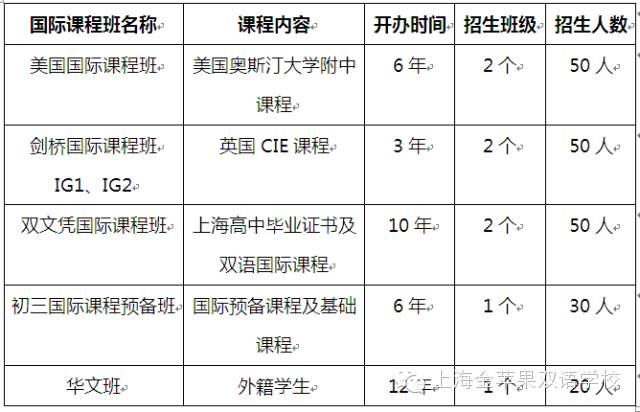 2016年秋季国际部招收新生班级及人数 招生对象:初三毕业生及同等学力者(剑桥IG1班招收优秀初二学生)。招生条件:不受户口和学籍限制,参加学校英语、数学入学考试培养目标:美国、英国、加拿大及澳大利亚等国留学。国际课程班介绍 1美国国际高中课程班(UTHS) 美国德州奥斯汀大学附属高中授权上海金苹果双语学校(中国大陆唯一授权校),开设美国国际高中课程,学生学籍注册 在美国,完成26个美方认可学分,颁发美国教育部(TEA)认证的高中毕业证书,畅通申请全球一流大学,尤其是美国前 100名的大 学,享有与美国本土高中学生同等的申请便利条件。 English (英语)、 Algebra (代数)、 Geometry (几何)、 Pre-Calculus (微积分), Chemistry (化学)、 Physics (物理)、 Earth Science (地球科学)、 Biology (生物), World Geography (世界地理)World History (世界历史)、 U.S History (美国历史),U.S. Government (美国政府)Economics (经济学)、 Psychology (心理学), Communication Applications (演讲与技巧)、Health (健康)、Fine Art (艺术)等。 2双文凭国际课程班学生在金苹果学校完成三年高中基础课程,获得上海市教委颁发的《高中毕业证书》(成人),同步完成全球雅思IELTS课程,雅思成绩达到国外大学录取标准,每周18节以上英语课,优秀中外教授课,开设欧美文化、外教口语、双语国际化课程等,同步获得上海市《高中毕业证书》和雅思证书双文凭。畅通便捷申请英国、美国、澳大利亚、加拿大、新加坡等国家的大学(预科),出国留学成功率100%。3英国剑桥A-Level课程班(IG1\IG2) 1.招生对象A-Level课程IGCSE 1年级:优秀初二学生或初三成绩一般学生;A-Level课程IGCSE 2 年级:优秀初三毕业生,高一或高二在读学生。2.招生计划A-Level课程秋季班IGCSE 1年级招收一个班,25人;A-Level课程秋季班IGCSE 2 年级招收一个班,25人。4初三国际课程预备班国际高中预备课程和初中基础课程同步进行,每周英语课程18节以上,让学生完成初中基本课程的同时,提升英语能力,适应英文授课。培养学生国际化视野和适应国际课程的能力,打好英语基础;培养学生适应新环境能力、生活自主自理能力、与人沟通能力。比同龄学生提前一步跨入国际课程,赢在起跑线上。5华文中心招收1至12年级的在读外籍及港澳台华侨学生,华文中心作为金苹果学校国际部的一部分,为留学生提供优质国际教育课程。我们的学生来自世界各地二十多个国家和地区,这使得在金苹果学校国际部的学习与生活变得更加丰富多彩。课程开设:汉语HSK、中国文化、英语、双语数学、双语科学(物理、化学)、体育、计算机、艺术、游泳等其它选修课程和兴趣课(如:钢琴、舞蹈、跆拳道、武术、学做中国菜等)。住宿:2人一间空调寝室,独立洗手间和淋浴房;餐饮:可选择中餐或西餐。招生考试标准学生必须参加严格的统一入学考试,择优录取,其中包括:a.笔试:英语:满分100分 数学:满分110分(含一题英文数学附加题10分)b.面试:笔试入围学生还需经过中、英文双语面试考察学生的英语水平和综合素质。 入学流程(一)咨询、填写报名表网上报名:www.jinpingguo.com.cn(二)提交照片(三)通过笔试、面试后发放录取通知书(四)缴纳学费(五)发放正式入学通知书 国际课程招生说明会安排上海金苹果学校国际部在今年寒假增开2个新生班级的基础上,2016年秋季招生国际课程12个班,分别为:美国国际课(UTHS)2个班,剑桥国际课程2个班,双文凭国际课程2个班,初三国际课程预备班1个班,华文(外籍学生)1个班,另招收小学、初中剑桥国际课程4个班。2016全校国际课程班(除6个毕业班外)将达到30个班级,在读人数600人以上,为了满足学生和家长的需要,本学期将在3月26日、4月9日、4月23日、5月7日和中考结束后举行国际课程说明会,届时已录取国外顶尖大学的学生、家长、国际课程专家、中外教师团队将会与家长们面对面,分享金苹果学校国际课程12年的丰硕成果、办学理念、国际课程等。 学校官网:www.jinpingguo.com.cn(可网上报名)国际部咨询电话:6897 3118, 6897 3866(周老师、王老师)68970062(王老师,双文凭国际课程)68970063(李老师,美国国际课程)4006897102(涂老师,剑桥国际课程)