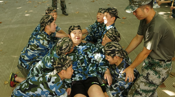 上午大家没有训练,而是做了拓展活动。为了让大家懂得团结合作,教官让每个连派出七名同学,手挽手围成一圈面朝外,然后坐在地上。教官一声令下七名同学需要尽快站起来。听起来,做起来却十分困难。当同学们一起站起来时,很容易用力不均,有些手分开了,有些就倒下去乱作一团。今日的训练场上少了一份严肃与紧张,多了一片欢声与笑语。