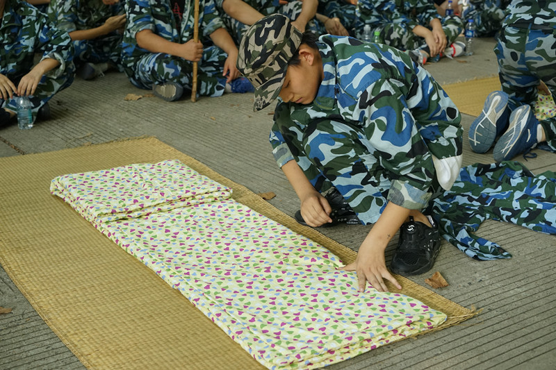 今天同学们除了正常的训练外还学习了叠被子。教官们手把手教同学叠军被。软软的被子在教官娴熟的手法下,短短几分钟就成了有棱有角的“豆腐块”,同学们很快的领悟到叠被子的要诀“三分叠、七分整”。看着他们小心翼翼地抹平每一个被角,每一寸褶皱,轻轻地折叠、压平,追求每一个细节的完美,最终呈现在眼前的是豆腐块的效果。