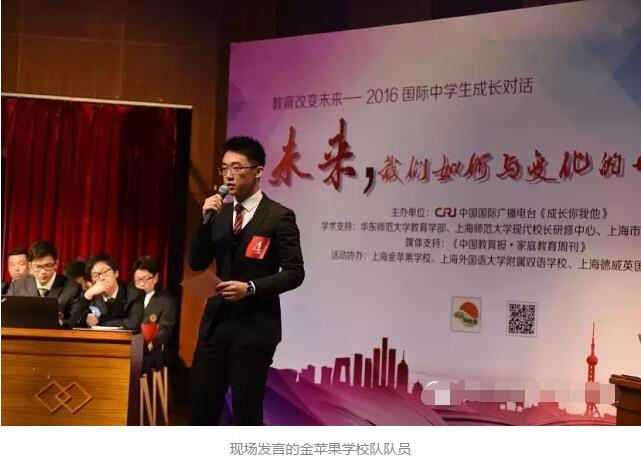 11月25日上午,中国国际广播电台《成长你我他》栏目在上海金苹果学校举办“‘教育改变未来’——2016国际中学生成长对话”,来自三所国际高中的29位同学在现场展开热烈讨论,专家评委及来自上海金苹果学校、上海外国语大学附属双语学校和上海德威英国国际学校三所学校的师生等400多人观看了这场别开生面的对话。