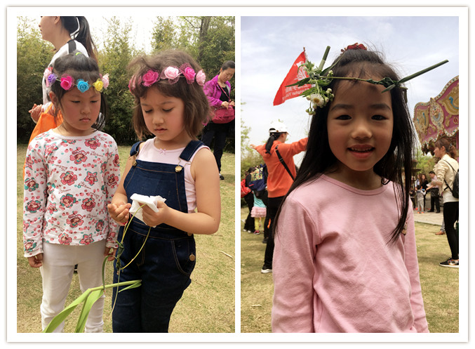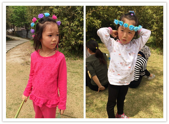 戴上花环头饰,变身成一个个美丽的花仙子,在午后春风的衬托下翩翩起舞吧!你们瞧,我美吗?