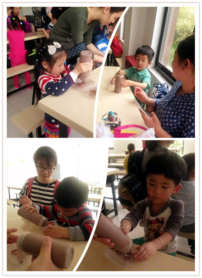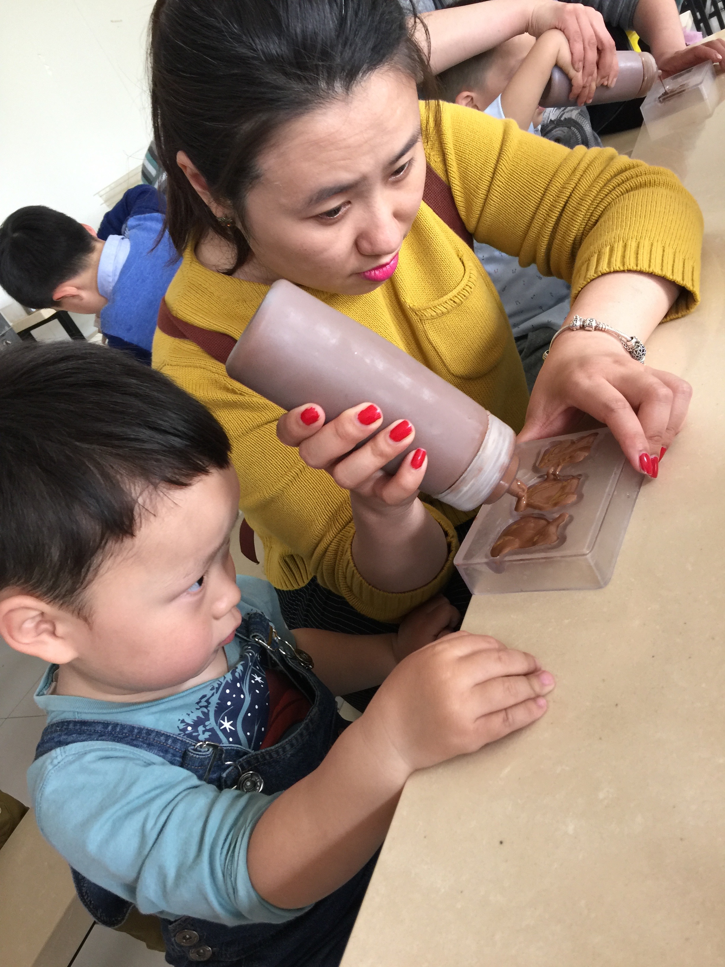 DIY巧克力制作──小手紧握着填满温热巧克力糖浆的瓶子,小心翼翼的将液体挤入小熊造型的模具,再耐心地等待冷却,不一会儿一盒盒包装好的巧克力就送到我们的手中咯,原来五花八门、各种造型的巧克力是这样变出来的啊!