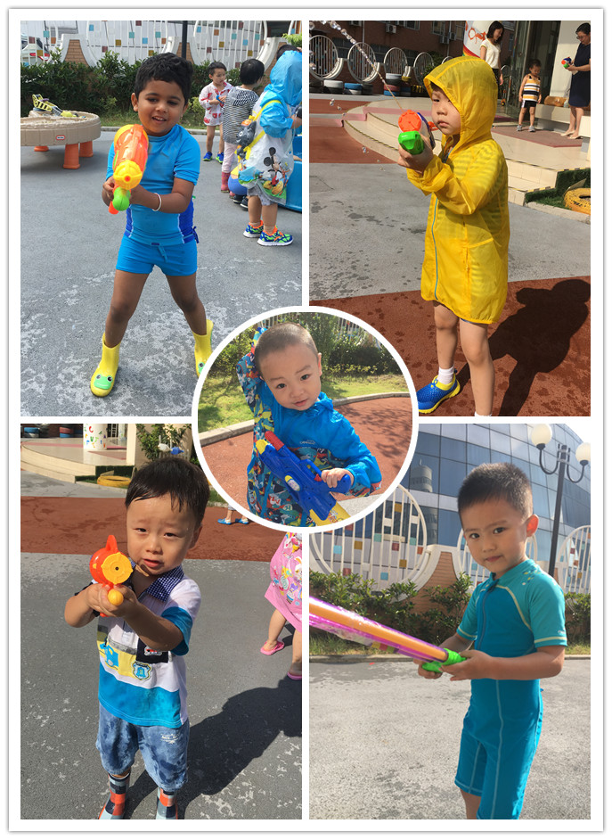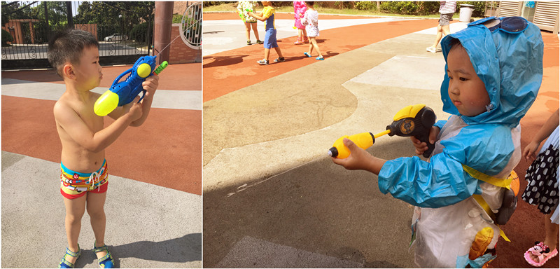 快看!中大班的孩子们化身勇敢的水枪战士,穿好美丽的泳衣,可爱的防晒服来对战气球啦!哇!他们可真厉害呀!一个个的都瞄准气球发射子弹喽!
