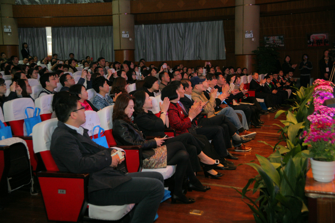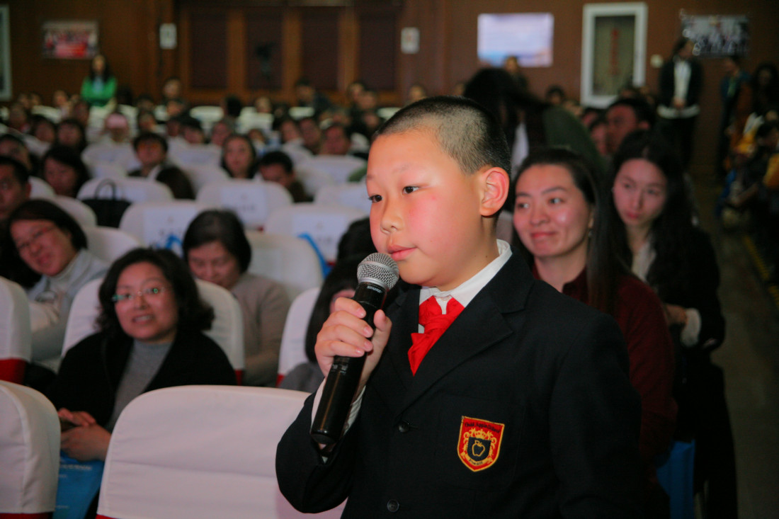 主要领导合影留念(左起依次:于家太、谭轶斌、尹后庆、曹可凡、张文荣、胡福臻) 金苹果学校创办人、亚龙集团董事长张文荣先生陪同介绍 曹可凡先生亲切与金苹果学生交流 论坛开幕倒计时 主持人谭轶斌老师讲话 曹可凡先生开讲 曹可凡先生的演讲非常精彩,在场观众座无虚席,整整近两个小时的聆听,不少观众拿着本子手写记录。 进入互动环节,曹可凡先生回答在场观众的提问及网络在线提问,每一个问题都力求解答详尽。 现场观众互动 金苹果学生提问 本次论坛采用了微信直播技术,在线问题提交及直播解答同时进行。 获得曹老师签名的出版书籍 金苹果学校少先队代表为曹可凡老师献花并系红领巾 与论坛工作人员合影留念