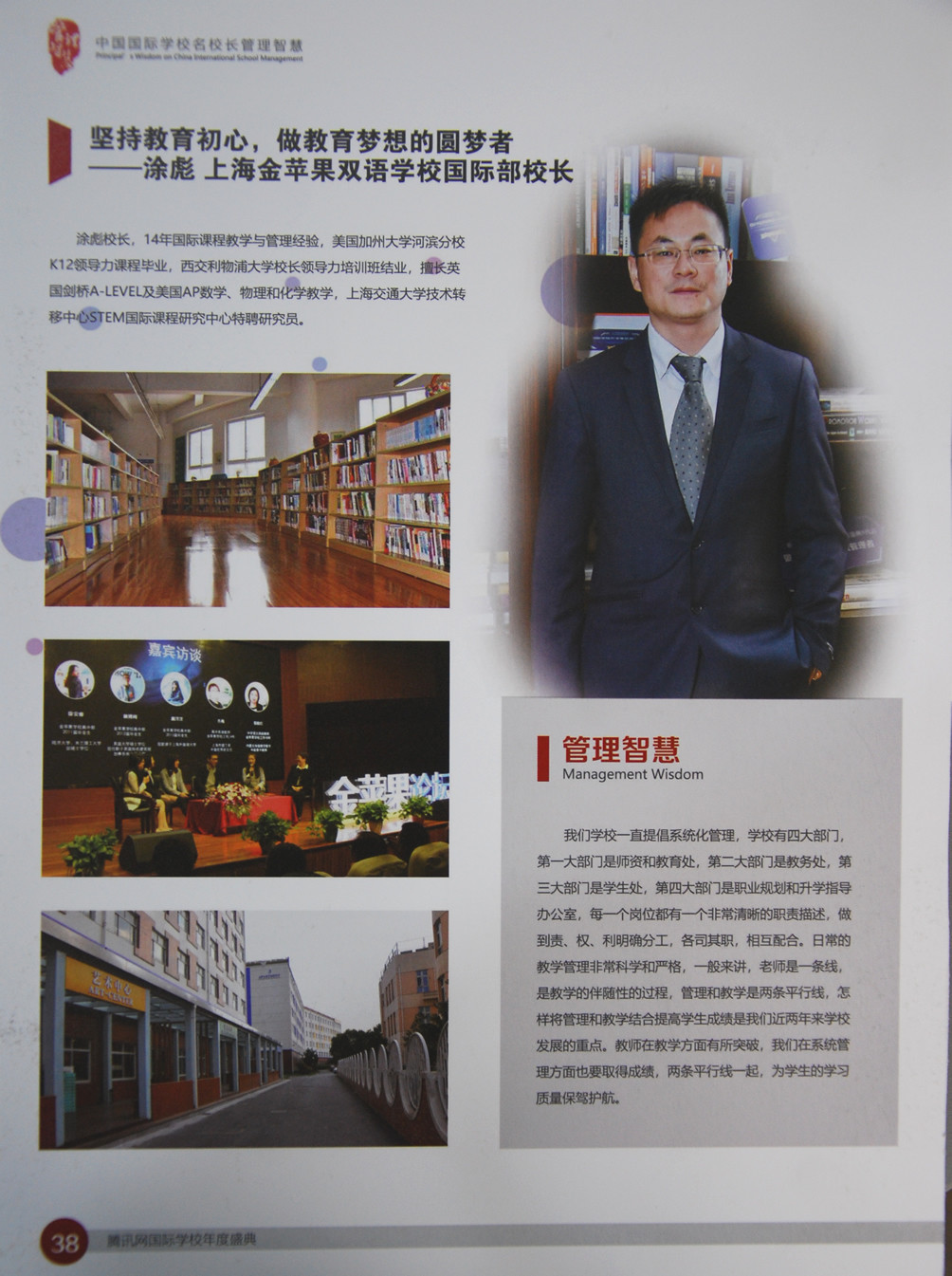 此外,上海市民办金苹果这校国际部校长涂彪的办学理念也被载入到《中国国际学校名校长管理智慧访谈录》册子里。